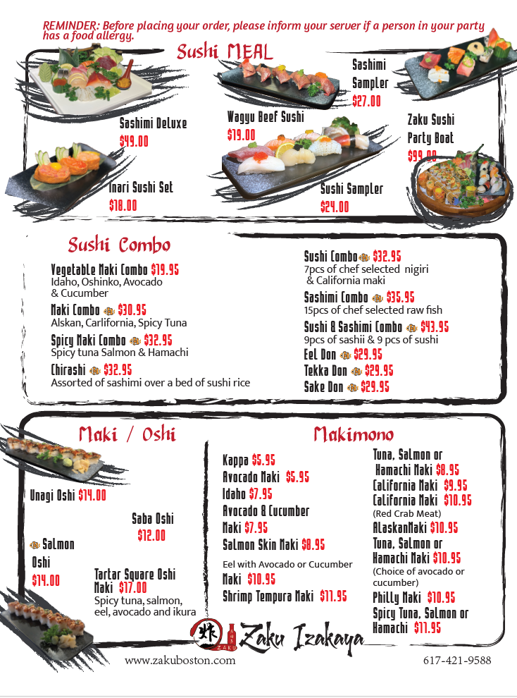 the menu at zaku izakaya has everything, sushi, to grilled meats, to noodles, fresh vegetables.